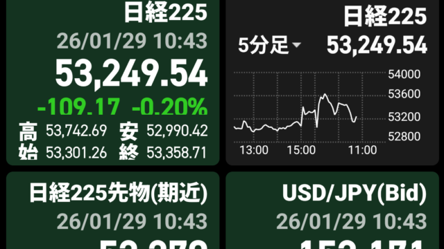 本日の日経平均です(10時時点)↓ なかなか大きく上げる相場が来るとやはり小さく下げたり小さく上げた...