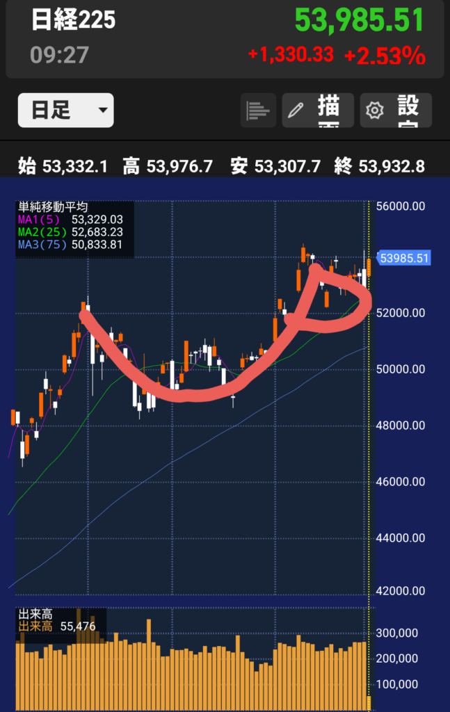 チャートの側近の高値を超えてくるとまだ伸びるかなと私は予測を立てて株を買ったり逆に越えなければ売ったりと取引をしています(スイング取引の為)
