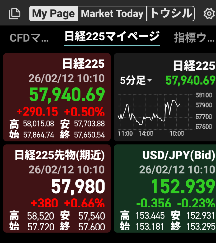 本日の相場も上昇相場です。一時58000円年高高値更新しました。後場に向けって利確が入っているのか日経平均のマイナスがチラホラ見えてきています。