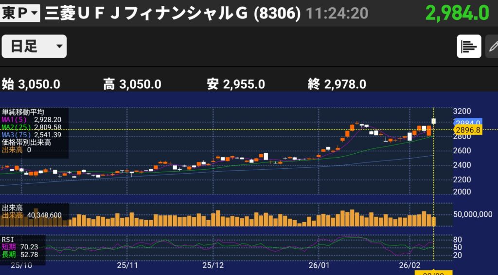 三菱UFJ銀行フィナンシャルグループ(8306)100株 株価2894.3 円